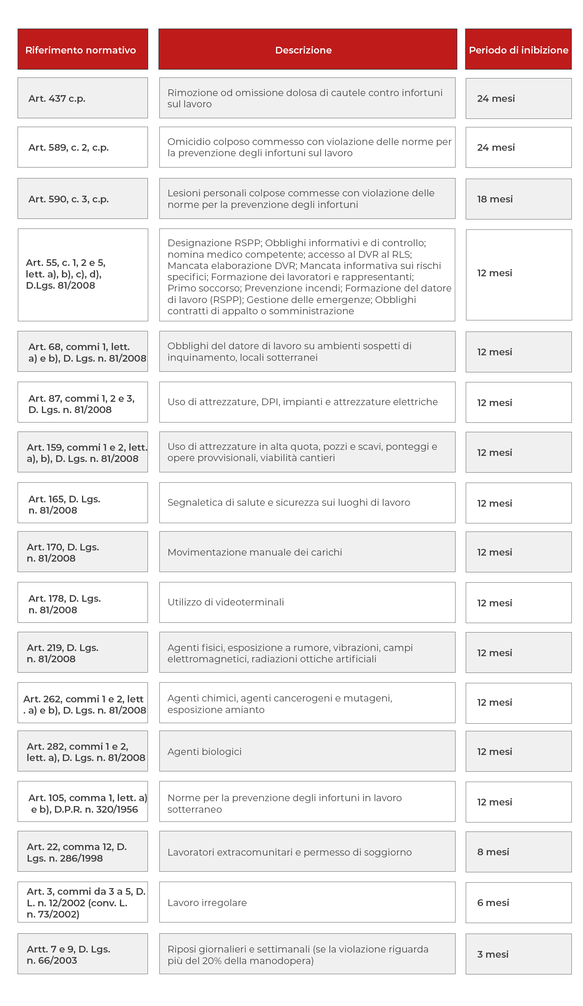 Pertanto, la generica dicitura relativa al “rispetto degli obblighi di legge”, viene rafforzato e specificato con particolare risalto a ciò che riguarda il rispetto degli obblighi in materia di salute e sicurezza sui luoghi di lavoro. A sua volta l’articolo 8 prevede che «[a]i fini del godimento di benefici normativi e contributivi sono ostative alla regolarità, ai sensi dell’art. 1, comma 1175, della legge 27 dicembre 2006, n. 296, le violazioni di natura previdenziale ed in materia di tutela delle condizioni di lavoro individuate nell’allegato A, che costituisce parte integrante del presente decreto, da parte del datore di lavoro o del dirigente responsabile, accertate con provvedimenti amministrativi o giurisdizionali definitivi, inclusa la sentenza di cui all’art. 444 del codice di procedura penale. Non rileva l’eventuale successiva sostituzione dell’autore dell’illecito».